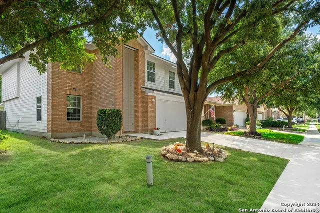 This home is nestled in a quiet loop across the street from the Shadow Mist Trail Head and Huebner Creek Greenway with quick access to Loop 410, San Antonio's Medical Center, USAA, Lackland AFB. Mature trees in front and a grand formal living/dining area with 20ft ceilings inside greet you as you enter this peaceful retreat. The open concept kitchen with island and breakfast nook overlook the second living area that boasts an elegant fireplace focal point. A convenient half bath and generous corner pantry complete the downstairs living space. The light filled backside of the home opens to a huge covered patio that extends the width of the house and leads onto a lush fenced in backyard. The top of the staircase opens to a nice-sized third living/loft area with a hallway leading to the home's three bedrooms and the convenient upstairs laundry. Both secondary bedrooms and the secondary bath are spacious. The primary suite features vaulted 9 ft ceilings with lots of light and French doors that lead to the 4-piece ensuite bath and walk-in closet. If you're looking for that spacious tranquil retreat in a great location with a dramatic "wow" inside the front door and a relaxing "ahhhh" outside the backdoor, then you've found it!